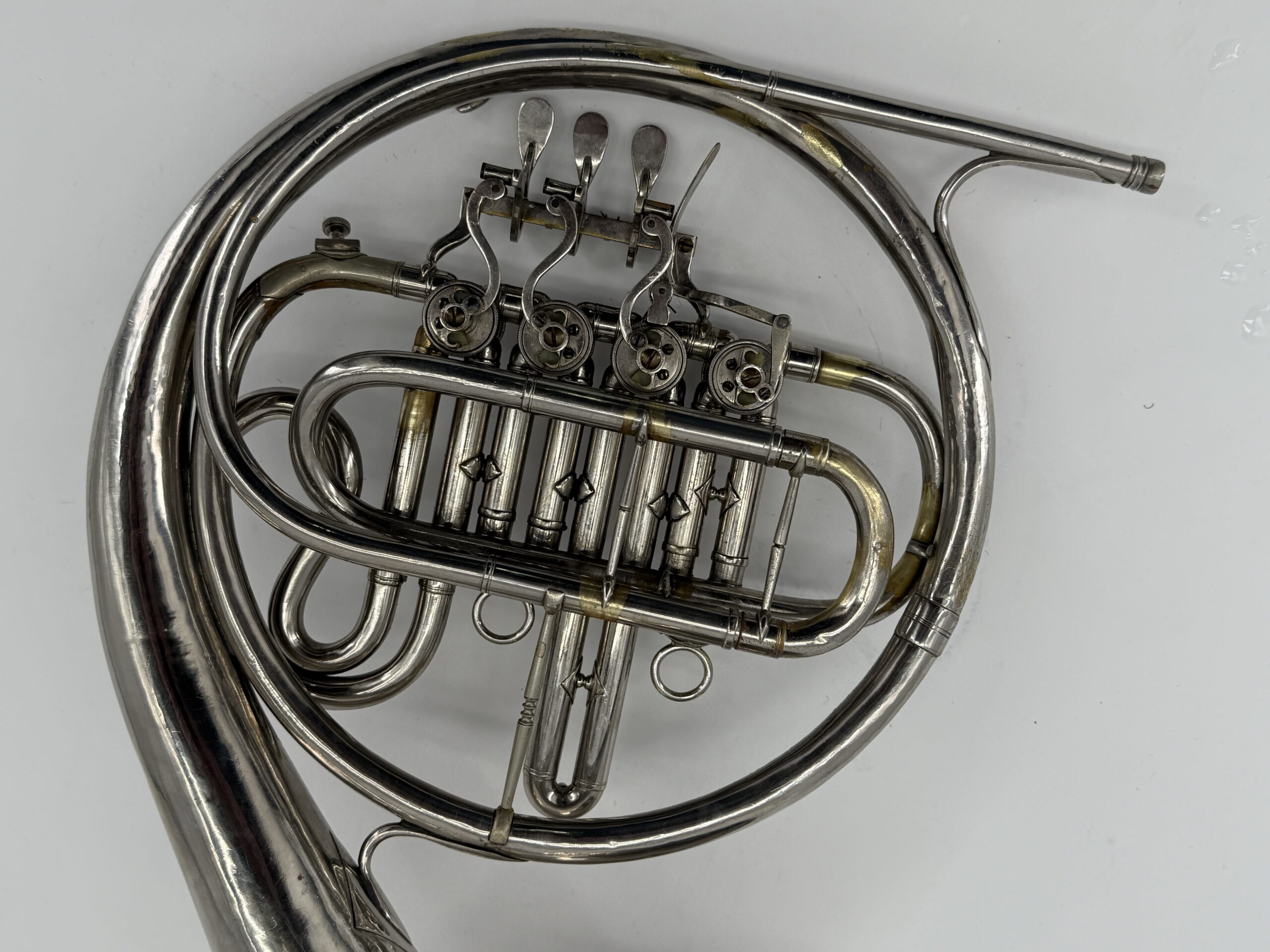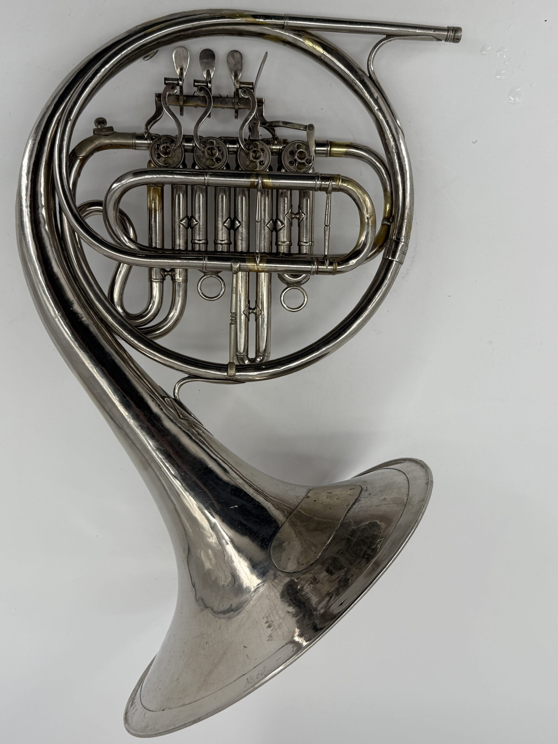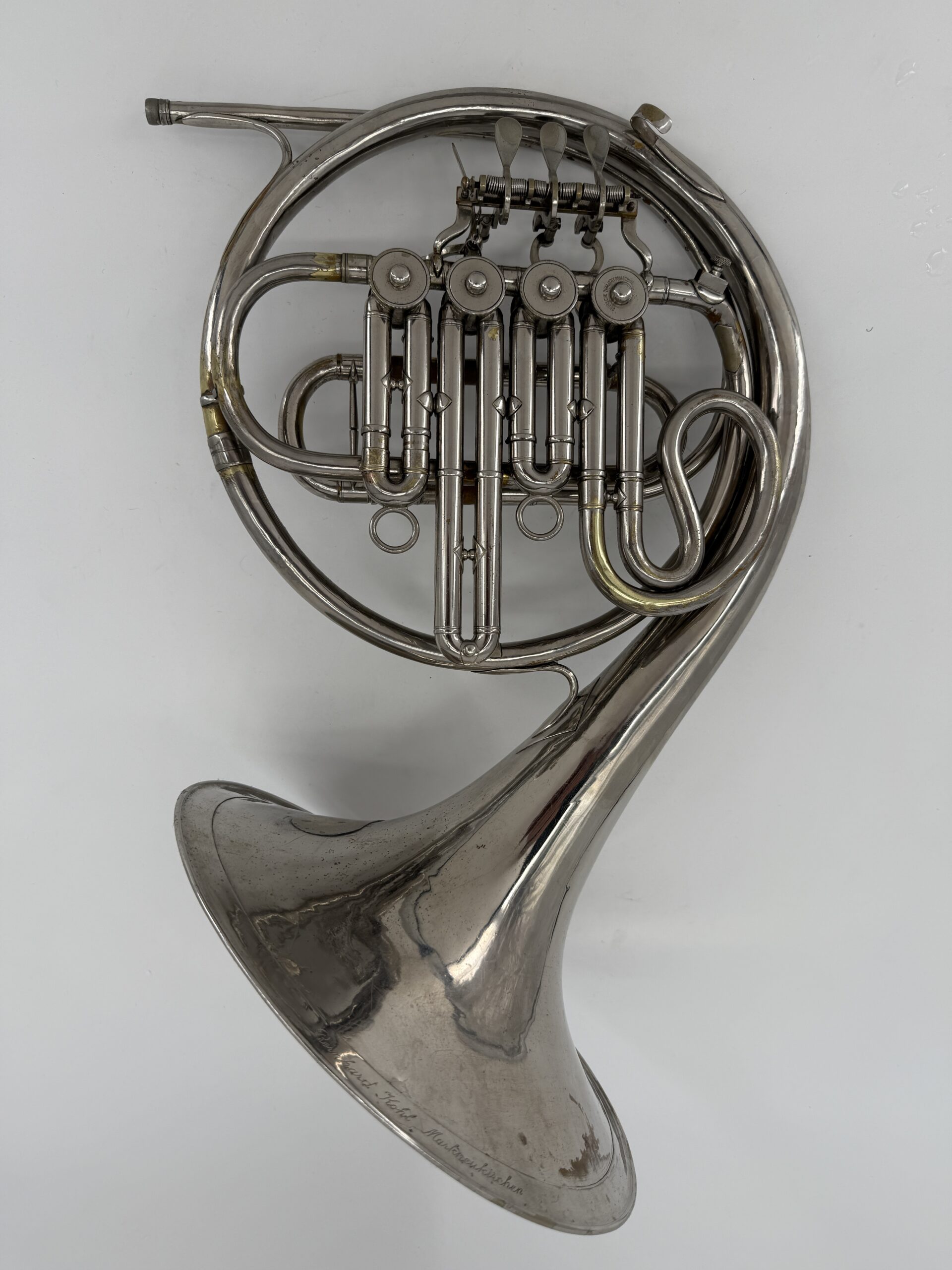 Bernhard Kohl – Markneukirchen single B flat : Yellow Brass/silverplated, fixed bell, stopping valve, unlacquered including case. (Inscription of Wehrmacht WWII) Repair patch on bell.