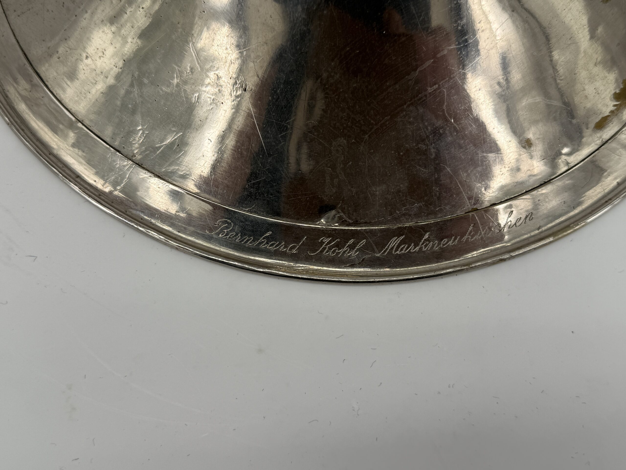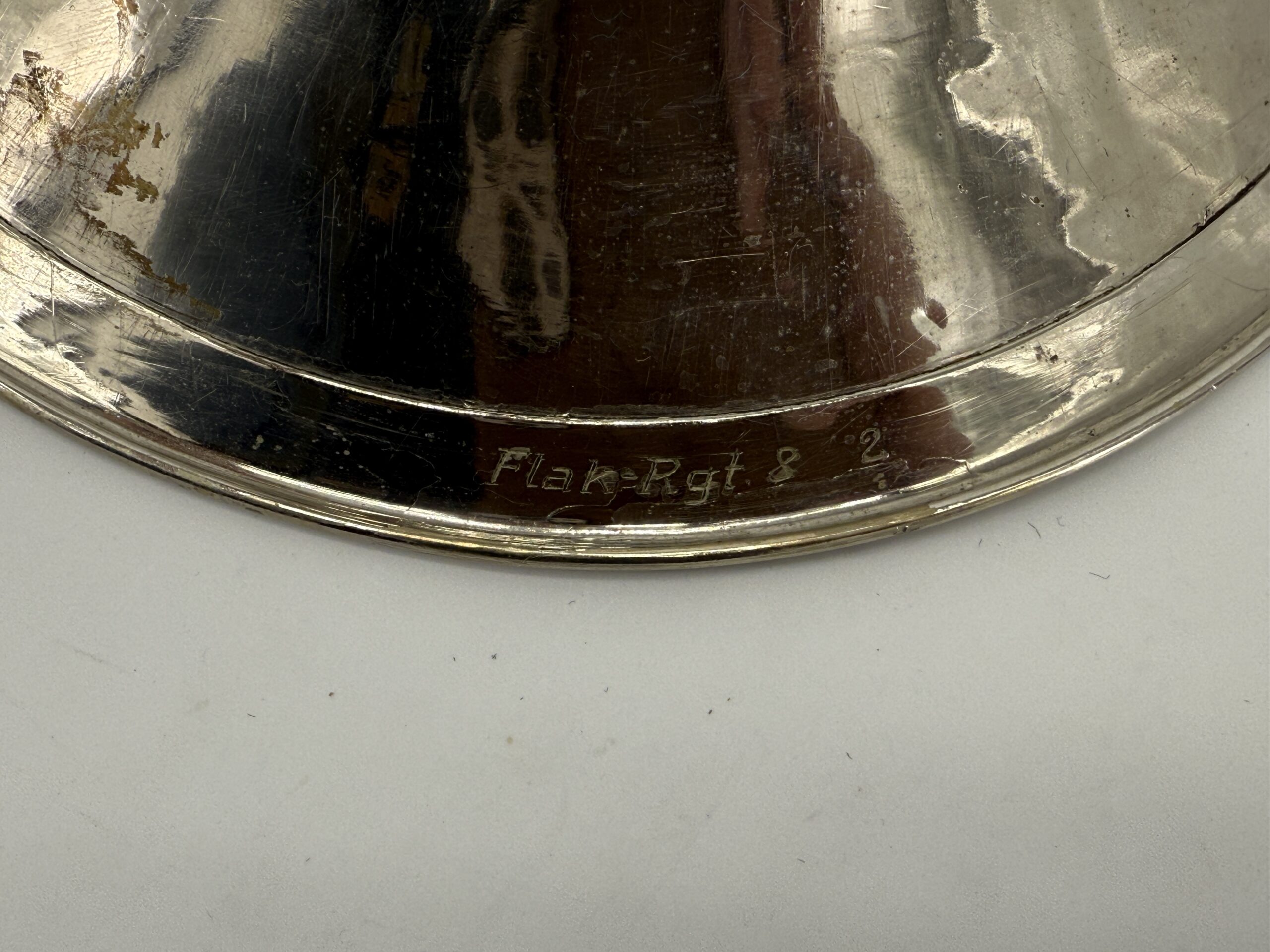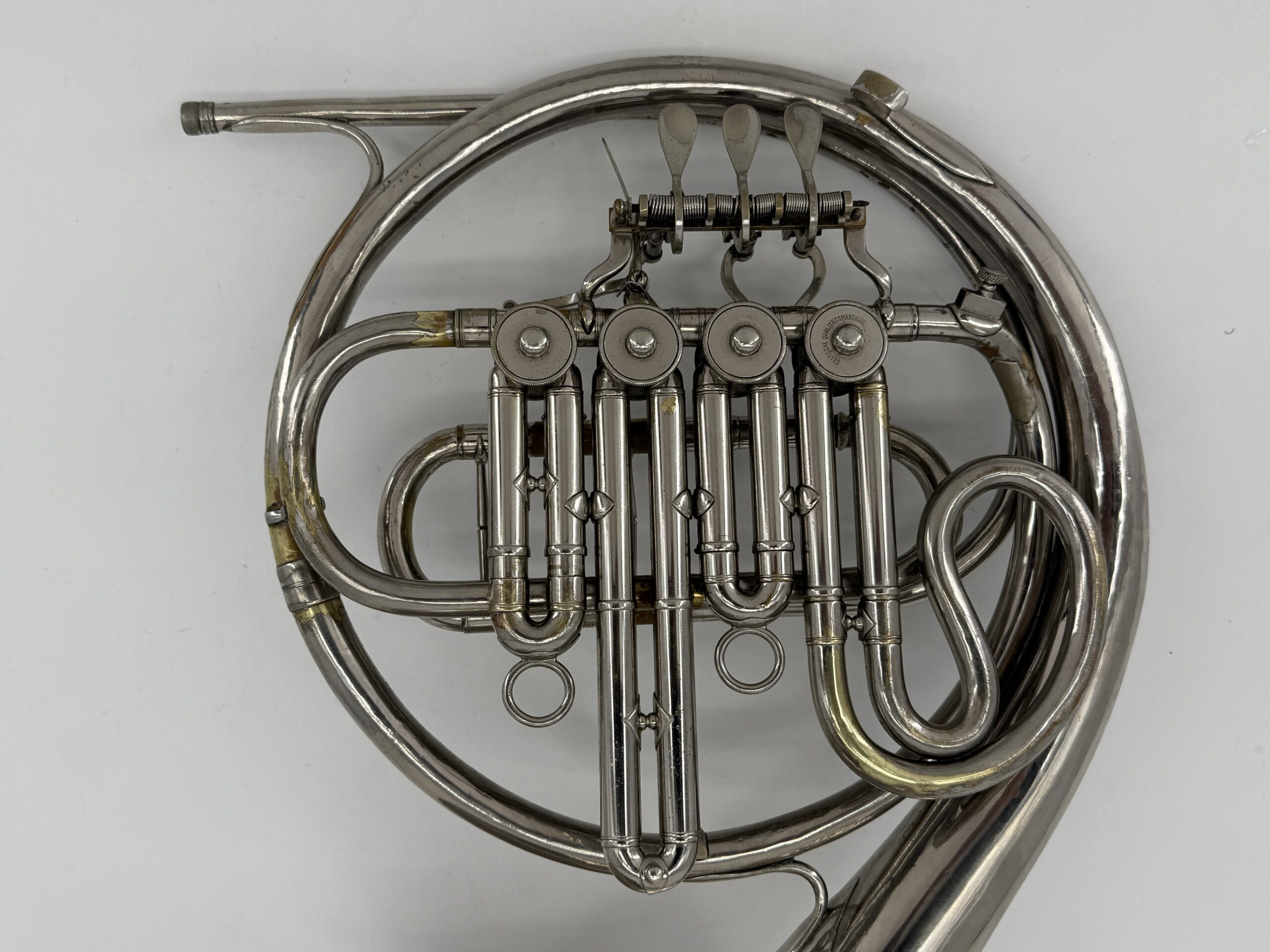 Bernhard Kohl – Markneukirchen single B flat : Yellow Brass/silverplated, fixed bell, stopping valve, unlacquered including case. (Inscription of Wehrmacht WWII) Repair patch on bell.