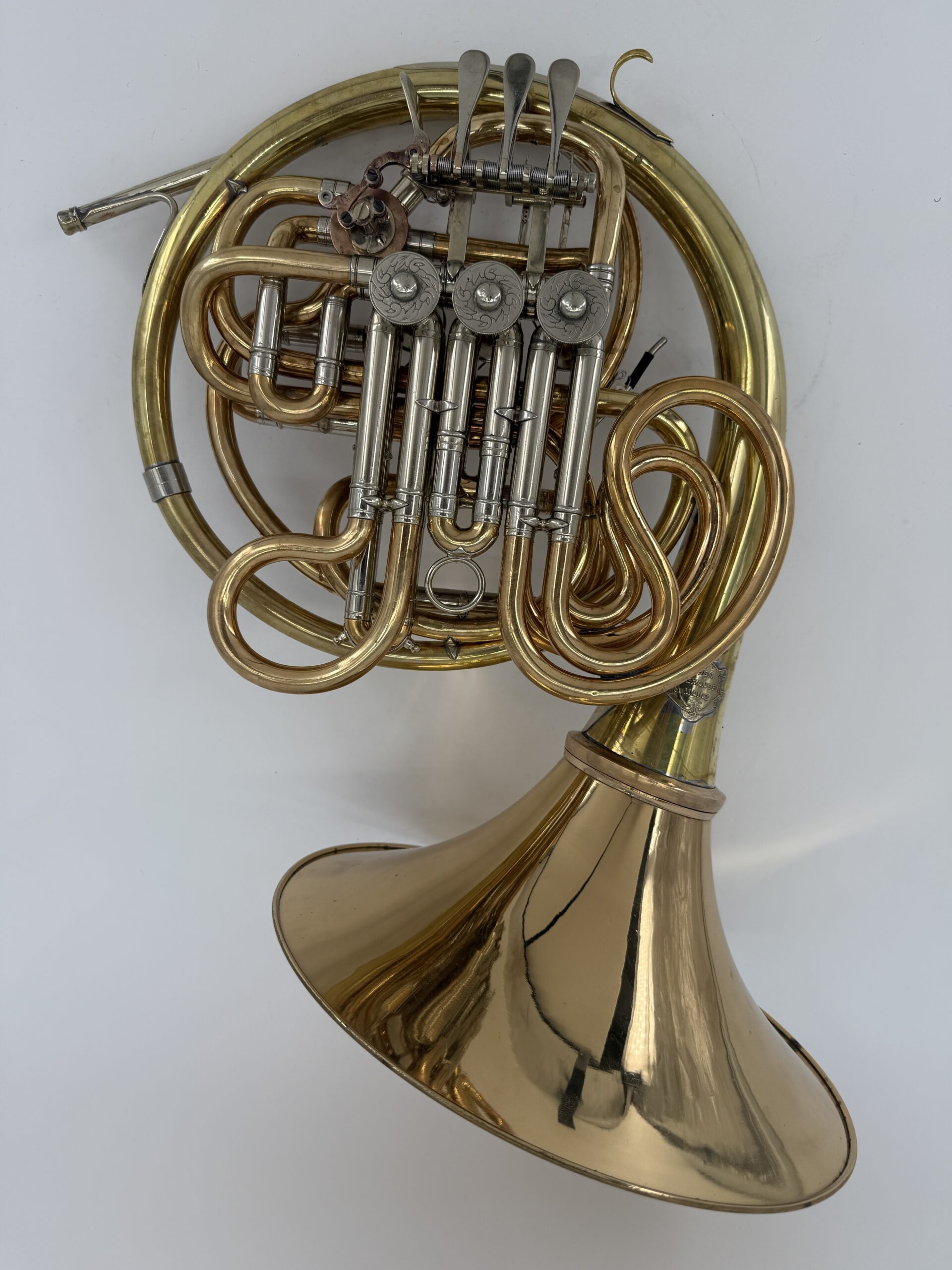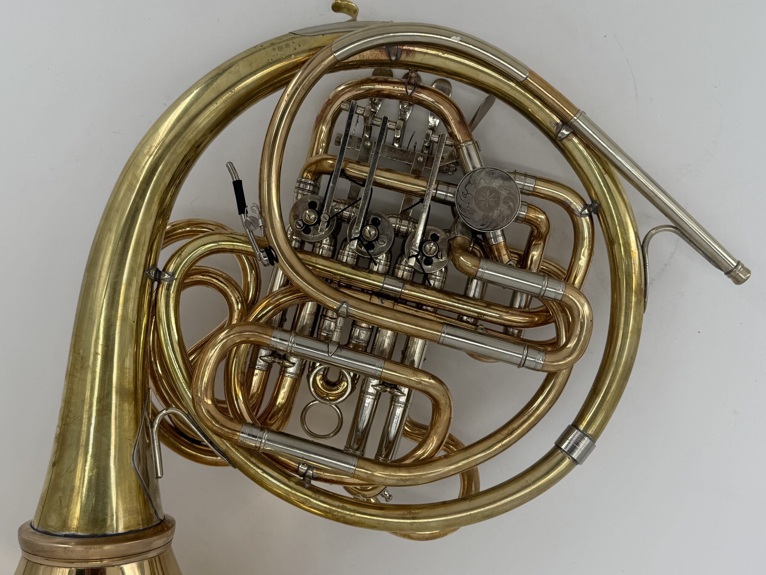 Gebr.Alexander 103 B/F Yellow Brass/Gold Brass, detachable lacquered bell, cor lever action, unlacquered including case.