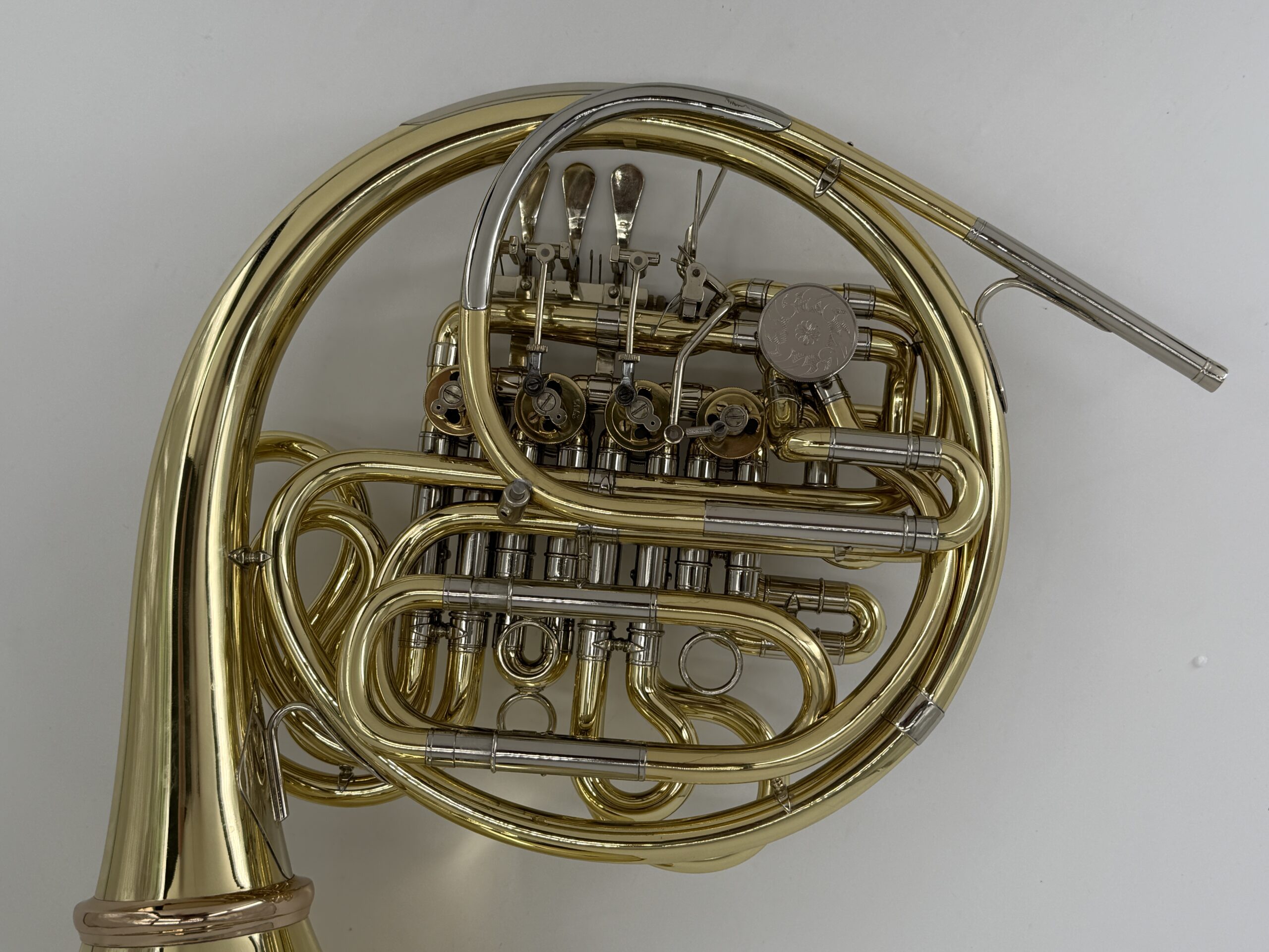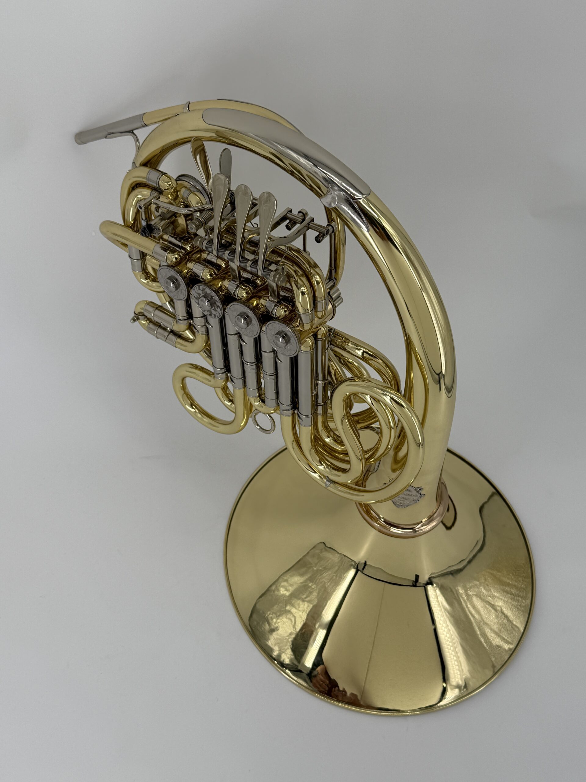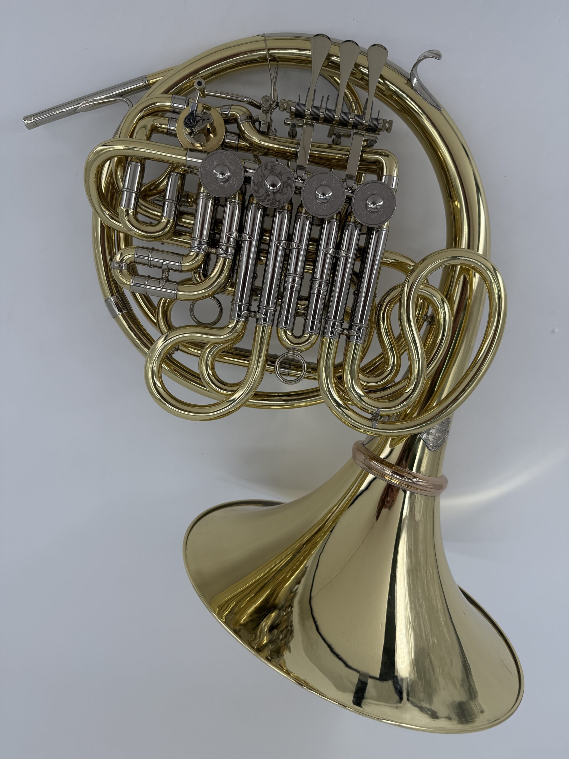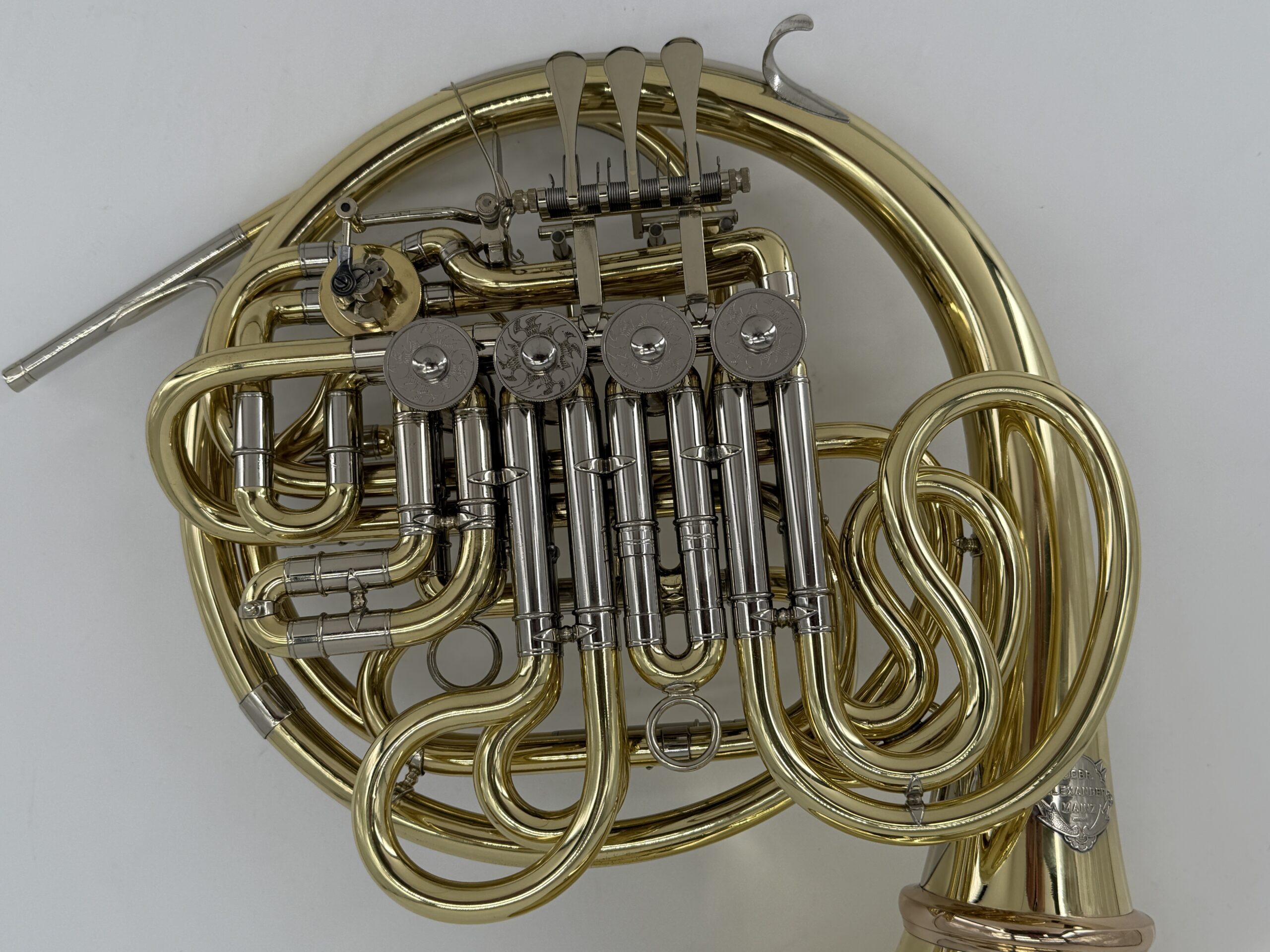 Gebr. Alexander 104 B/F : Yellow Brass, detachable bell, double stopping valve, lacquered (100%) including case.Serialnumber #2XXX.