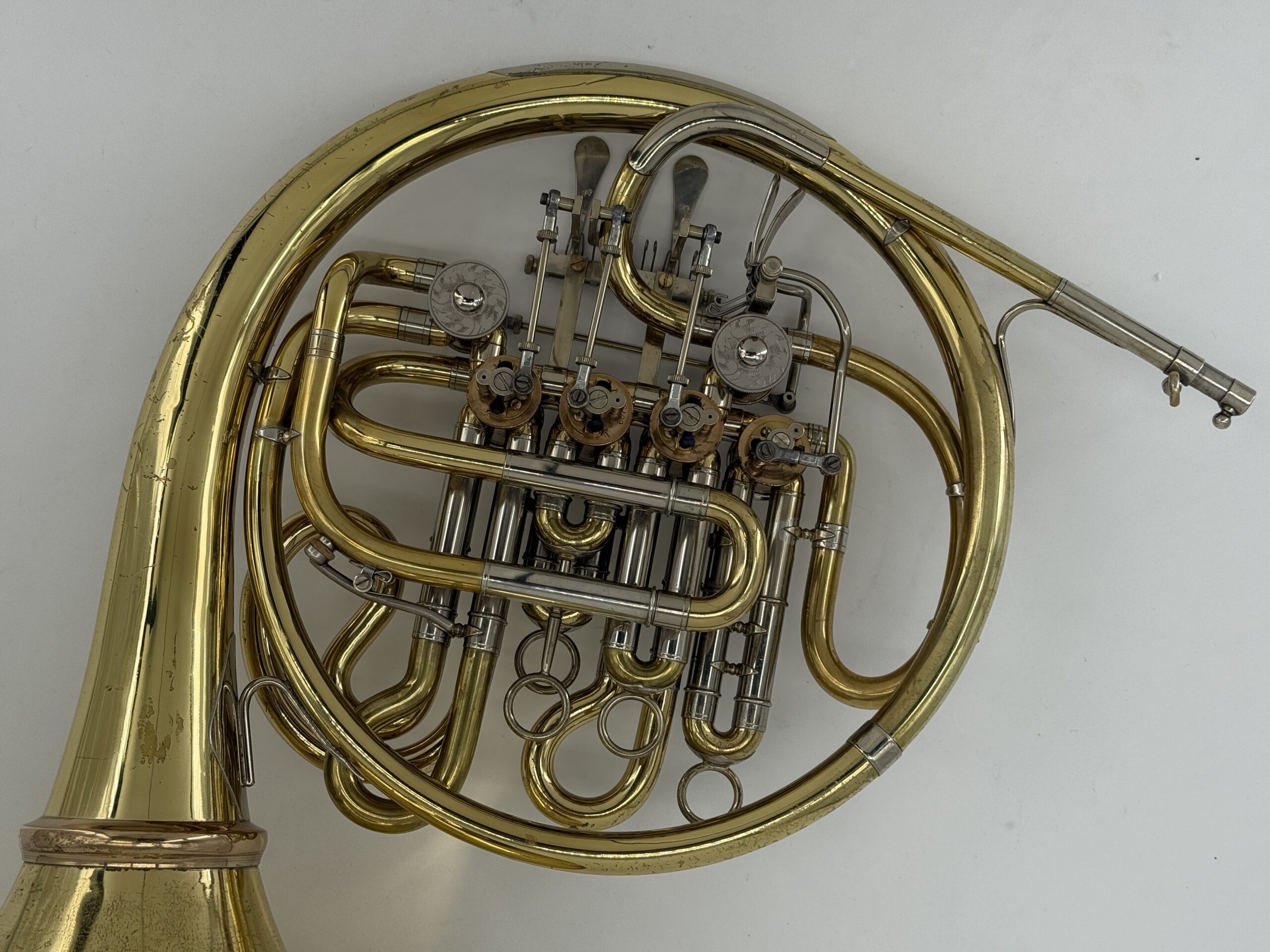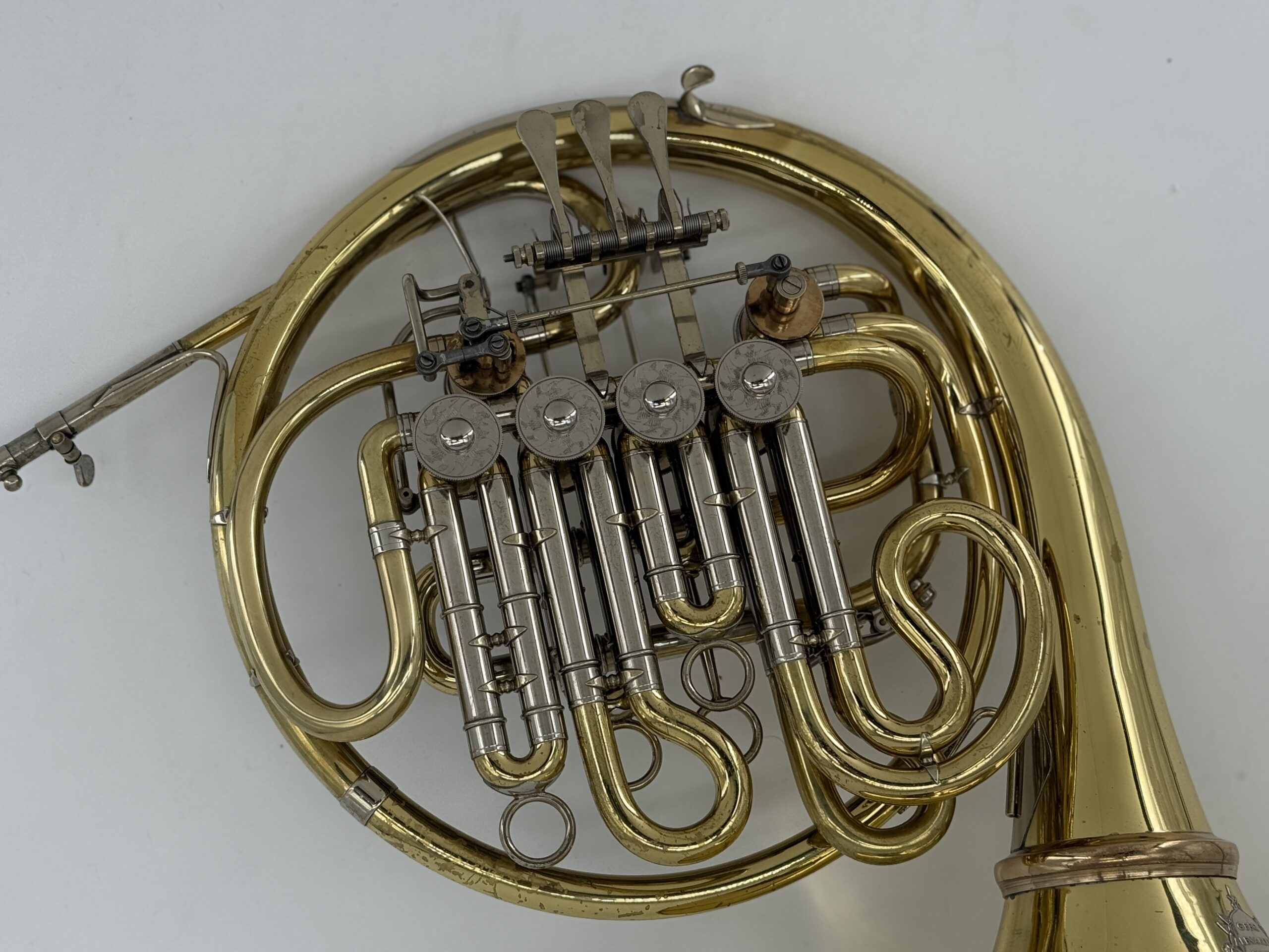 Gebr.Alexander 107 B/high F : Yellow Brass, detachable bell stopping valve, lacquered (80%) including case. Serial number : #6XXX