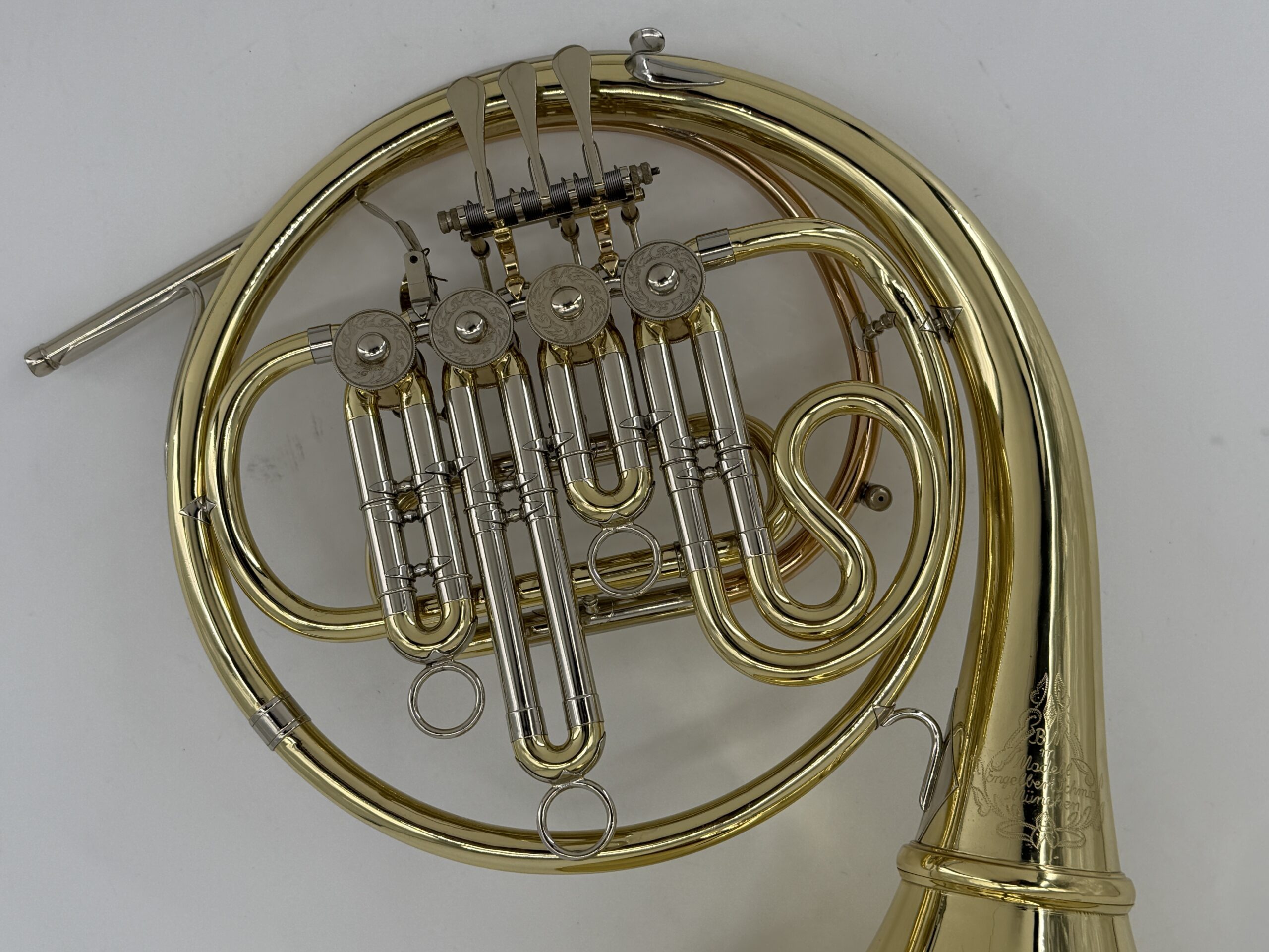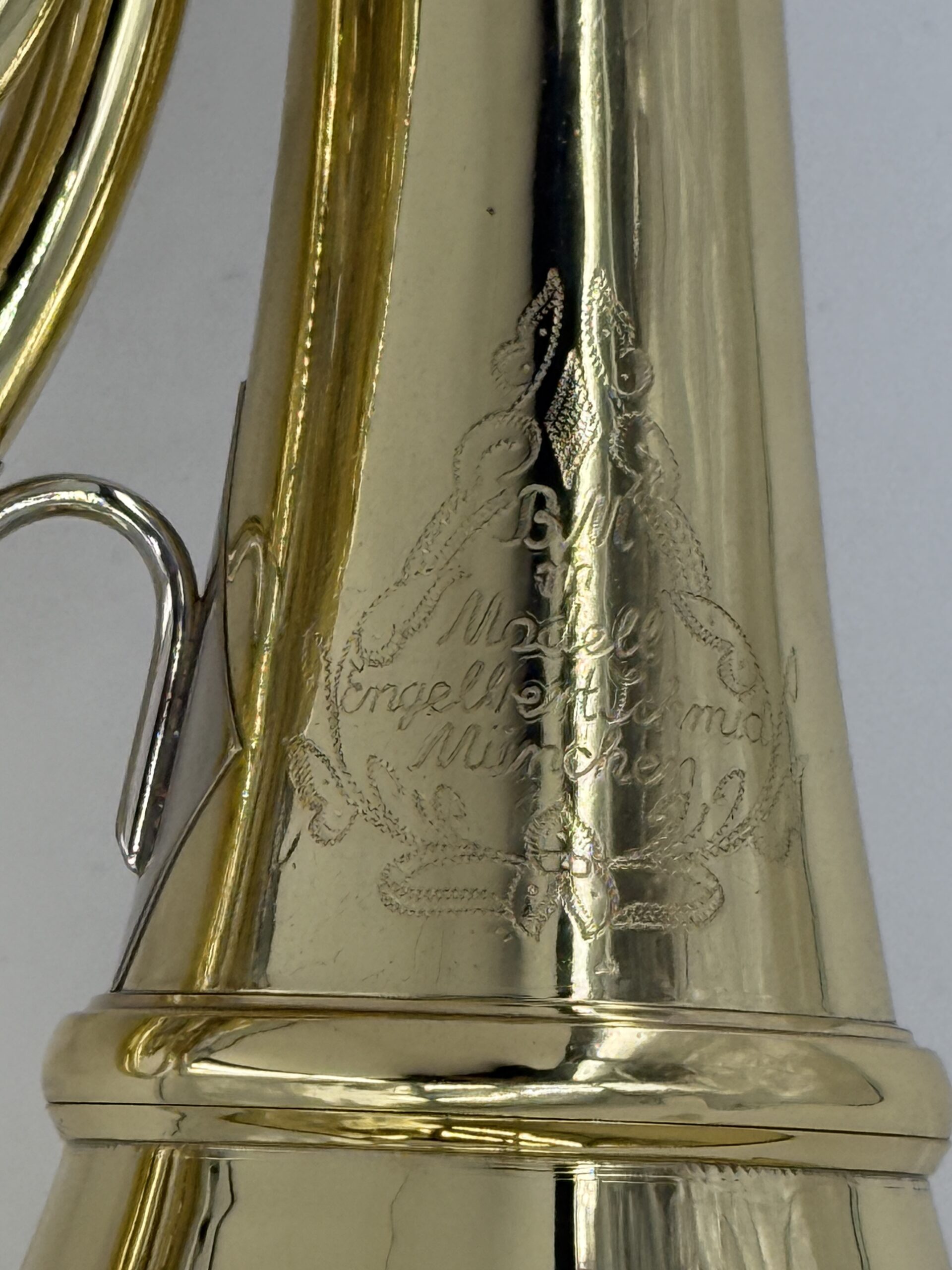 E.Schmid – model BM – München enkel Bes : Messing, afschroefbare beker, stopventiel, gelakt (100%) inclusief Gig Bag.